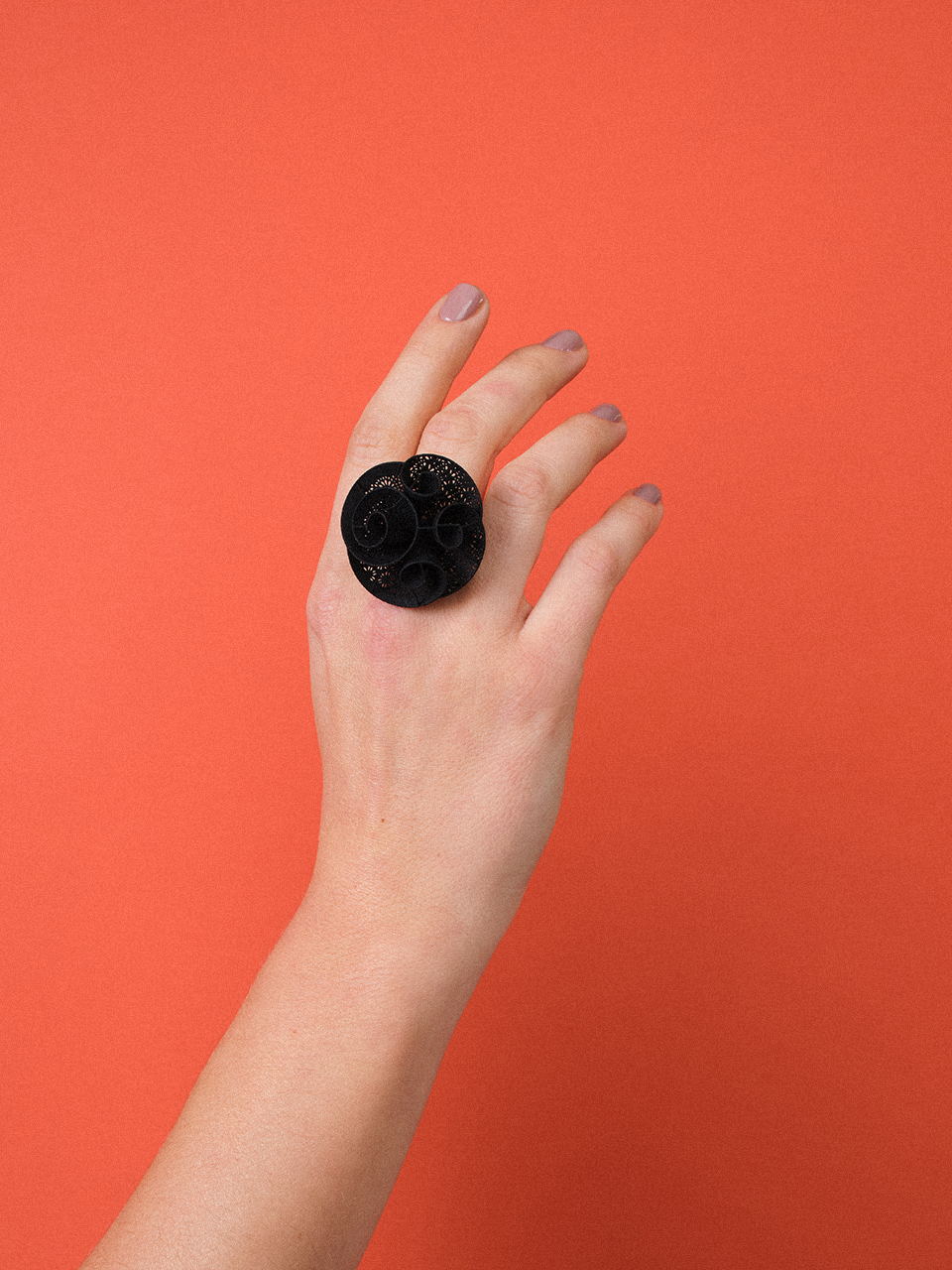 3D δαχτυλίδι με σκοτεινή, ανθισμένη έμπνευση, που συνδυάζει μυστήριο και εκλεπτυσμένη κομψότητα.